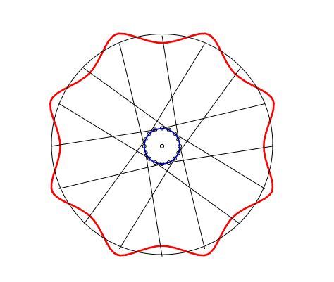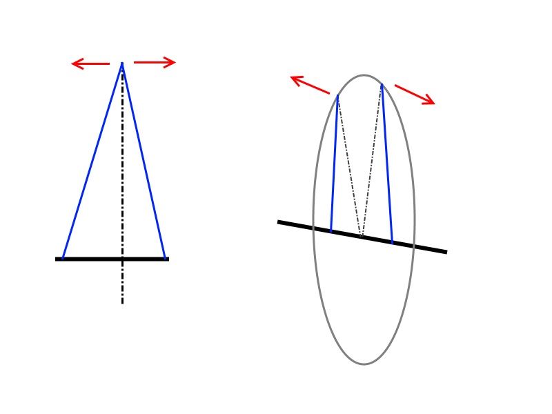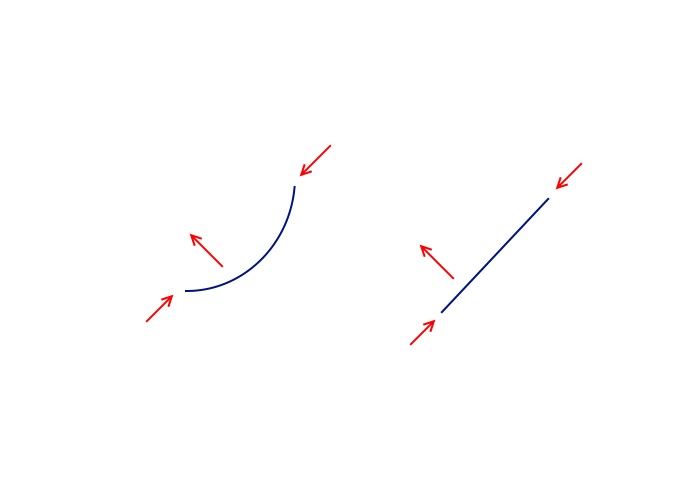 ↑上の8本スポークモデルは、実は円ではなく正八角形です。図のように、円弧を直線で近似しています。円弧をアイロンをかけるようにして伸ばしたものが右の直線です。直線にしてしまえば、圧縮や引っ張りの力は部材にモーメントを発生させません。しかし実際には部材は円弧ですから、圧縮や引っ張りはモーメントを生み出します。guru-dbさんが書かれているように、圧縮力が円弧を外に膨らませるように働きます。なのでリム全体では花びら型に変形すると言えます。
