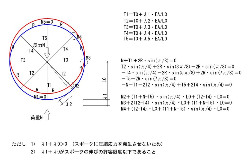 ちなみ荷重Nをかける前のスポークテンションをT0とすると、T0=-2R0・sin(π/8)