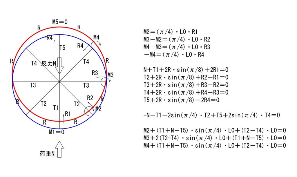 モーメントの式の中の、「T1+N+2R・sin(π/8)」というのは、リムのNの力が加わっている部分の鉛直方向のつり合いですからゼロということになります。ということで、モーメントは全部ゼロ。結局トラス構造と同じことになってしまいます。