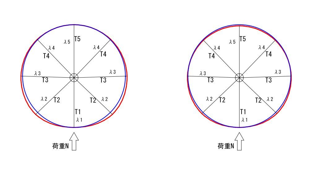とすると、λ2=λ3=λ4=λ5 ですから、左の図のようにリムは変形します。これはリムの周長が増えていますから、あり得ません。それにリムが変形しないと仮定しているのにリムを変形させて描いているのもおかしな話です。