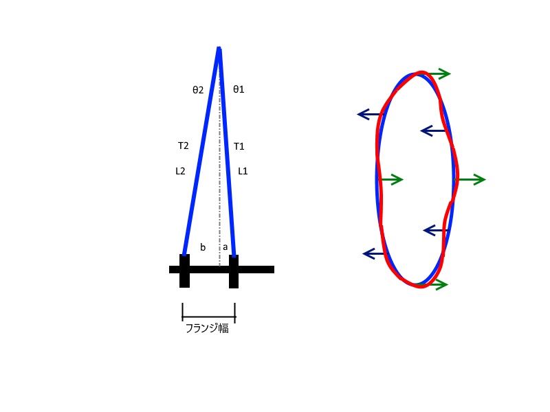 R:リムに発生している張力 実際にはリムには圧縮力が生じるので、Rはマイナスの数値になる
