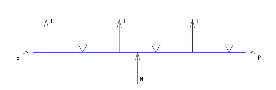 リムを1か所で切断し、横に伸ばしてみたのが右の図です。リムにはスポークによる圧縮力が働いているので、左右からPの力を加えて圧縮しています。ここに路面から入力Nを加えれば、リムに働く力は網羅できているはずです。