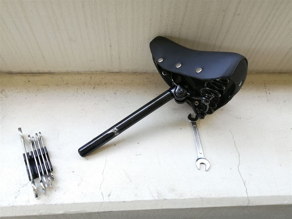 あとサドルは、コイルバネ付きのふわふわサドルです。交換したのですが、ポジションが決まるまでは無理です。というのは、今ハンドルが近いせいで、全体重をサドルで支えています。これくらいふわふわでないとたぶんに尻が持ちません。