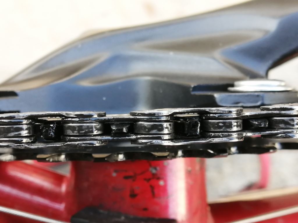 以前書きましたが、新品のチェーンはS字カーブを描いてリアからフロントに移動するのですが、ある程度使ったチェーンはS字を描けずフロントリア供に歯から外れた次のリンクから曲がってしまいます。この状況は酷使したチェーンほど顕著になります。
