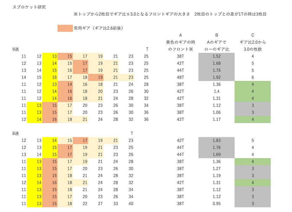 8速と9速について作成したのが添付の表です。フロントシングルで使えるものについては、どちらも3か4です。フロントダブルとすれば、5も可能です。9速で6がありますが、これはジュニアスプロケなので、ちょっと特殊です。ディレーラーの選択が難しいかもしれません。