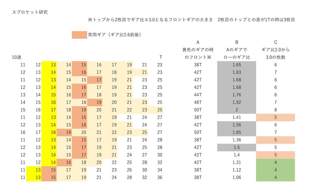 これをフロントのチェーンリングの歯数に関連付けて、スプロケットのすべての構成について調べようということです。フロントの歯数の決め方がAの列です。トップから2枚目で、設定したギア比の範囲の上限となるようにフロントの歯数を設定します。トップから2枚目としたのは、ギア比のトップ側の余裕を見込むためです。トップで3.5あれば十分です。ただしトップと2枚目が1T差の場合は、トップのギア比が3.5に届きません。なのでその場合は3枚目のギアでフロントの歯数を決めます。