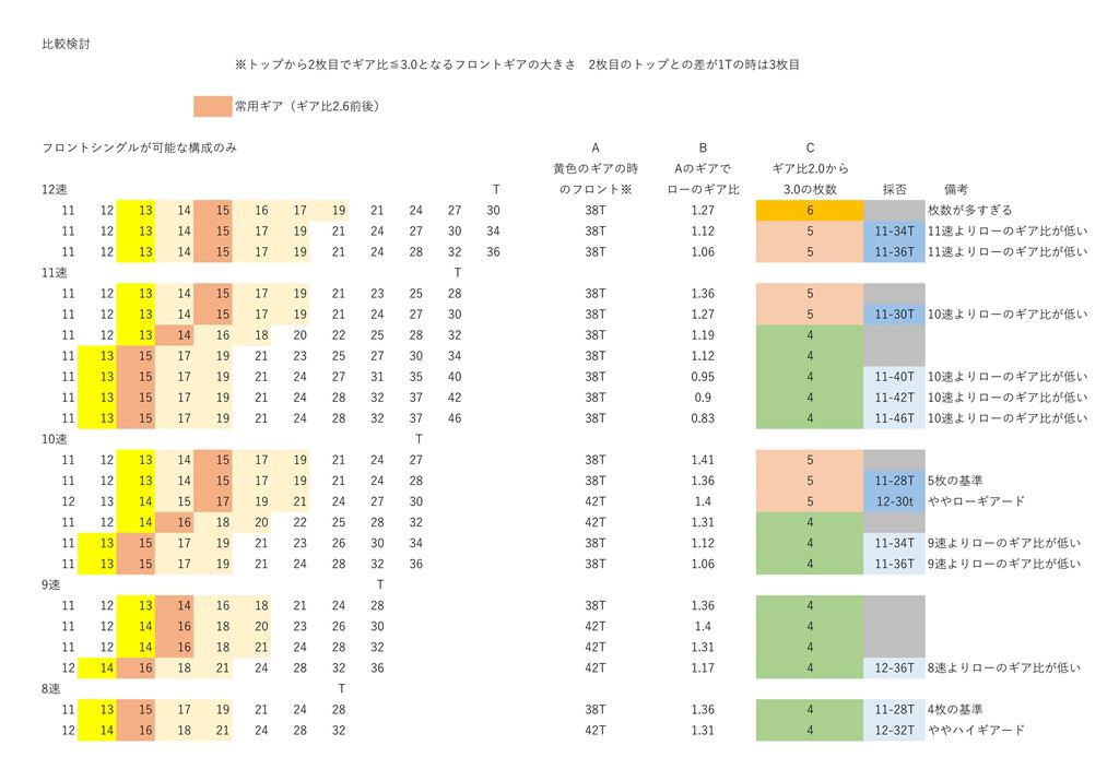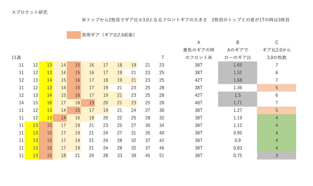 フォーマットさえ作ってしまえば、後は入力していくだけなので作成は簡単です。10速と11速の検討をしてみました。