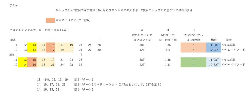 そこでまとめですが、残るのは4種類のスプロケットです。10速が2種類、8速が2種類。ローのギア比は同程度ですが、ギアの構成が異なるので、各2種類残しています。下の方で書いていますが、基本的なパターンは、13、14、15、17、19です(基本パターン1)。ここから14を除いたものがC列4枚に対応します。14始まりにして21を加えたものが、5枚の場合のバリエーションです。8速の、14、16、18、21というのは、異なる系列なので基本パターン2になります。