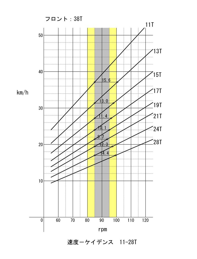 参考にシングルスピードの場合です。フロント48Tでリアが20T。ギア比2.40。変速がないので1本の直線だけです。ケイデンス90プラスマイナス10でカバーできるのは、6km/h程の速度域だけです。でも日常で使用するには不自由はありません。40km/h出せますし、5%勾配の坂なら苦労せずに登れます。以前「シングルスピード」というスレがあって、そこでいろいろ議論しましたが、ぼくは普段は変速なしでもそんなに困らないのです。変速が必要なのは、イベントとかで走る時と、山(峠)を走る時です。