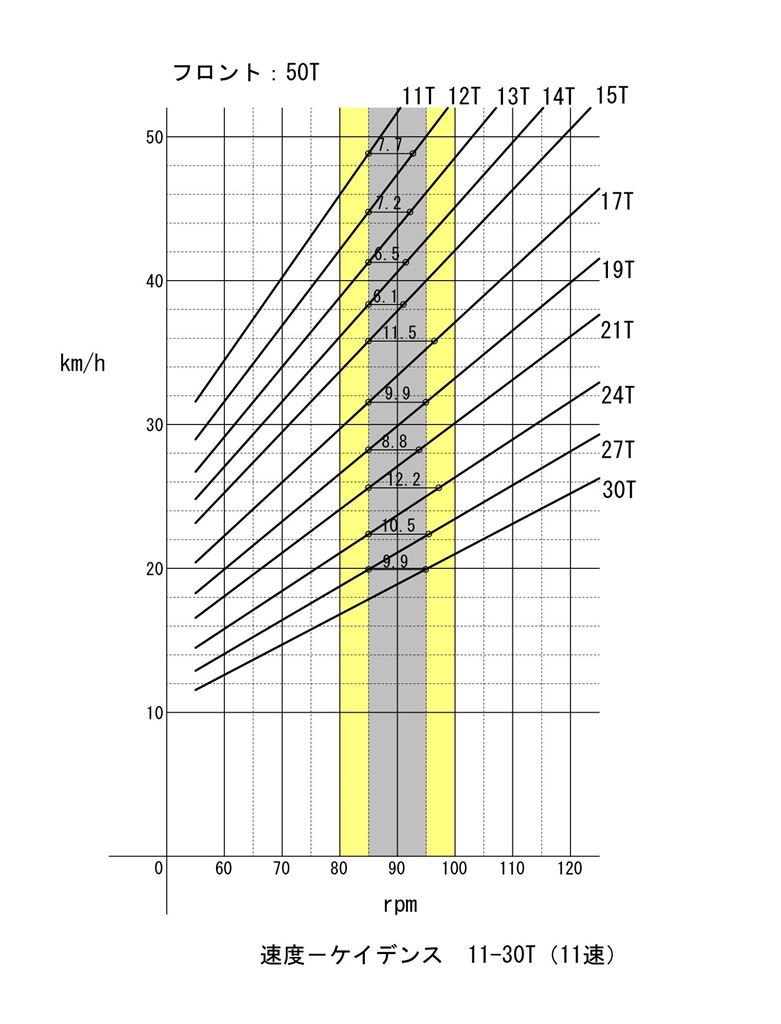 11速の11-30Tというスプロケットで同様に作図すると、左の画像のようになります。11.5とか12.2といったケイデンス差もありますが、差を10以内にしたいという意志が何となく見えてきます。ロー側の普段使わない領域は無視してもいいでしょう。使用頻度の高いギアで見ていきます。そうすると気になるのは、17Tと15Tとの間の11.5というケイデンス差です。間に16Tがあれば、もちろん10以内になります。11-25Tや12-25Tといったスプロケットには16Tが入っています。平坦コースならそういったスプロケットを使うでしょう。でも山岳と平坦の混じったコースでは、ローギアに30Tが必要になるかもしれません。そうなると妥協的に11.5は許容されているということかもしれません。