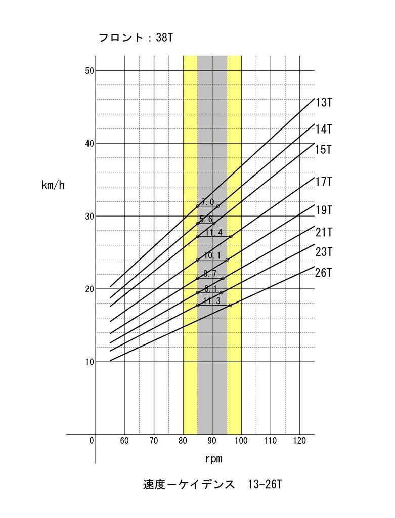まず13-26Tですが、ケイデンスを90前後に保つためには、速度2から3km/h毎に変速する必要があります。これはあまりにも頻繁すぎます。11-34Tの場合、低速域では3km/h毎、高速域では4から6km/hで変速することになります。ひとつのギアで5km/hの速度幅というのが、実感としては合っているような気がします。15Tで27km/hから32km/hをまかない、32km/hを超えたら13Tにシフトアップ、27km/hを下回ったら17Tにシフトダウンです。そうすると23km/hから38km/hが、17T、15T、13Tの3枚でカバーできることになります。平地はこれで十分。あとは山地ですが、実際に3km/h刻みで変速しているとは、自分では意識していないのですが、まあやっているのでしょう。