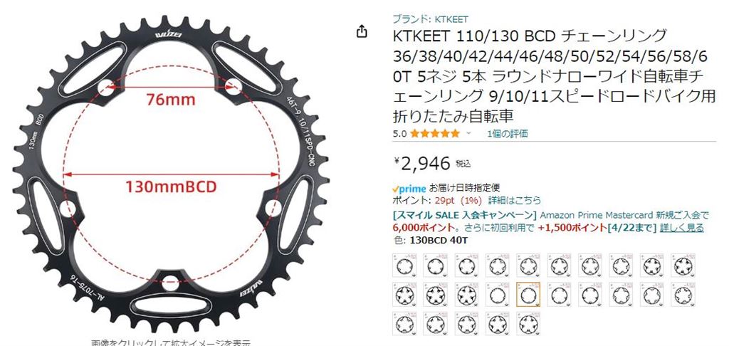 PCD110(コンパクトクランク)なら、36Tからあります。PCD130なら、38Tからあります。試しに38Tを注文しました。
