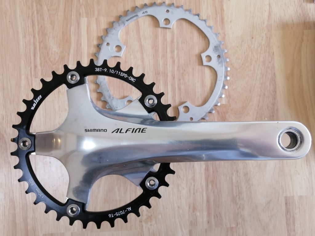 注文しておいた38Tのナローワイドチェーンリングが届いたので、ALFINEのクランクに付けてみました。ALFINEはPCD130で、シングル用のクランクということになっていますが、実はインナー側にもチェーンリングの取り付けが可能で、ダブルのノーマルクランクとして使えます。