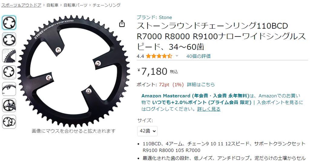 現在シマノのロード用4本アームのクランクを使っていて、手っ取り早くフロントシングルにするなら、こういうのを使う手があります。歯数によって価格は変わります。歯数が多くなるほど高くなります。ロードバイクのフロントシングル化なら、フロントは40T、42T、44Tあたりなので、7千円前後です。ちょっと高いけど、それでもWolftoothのチェーンリングの半額程度です。
