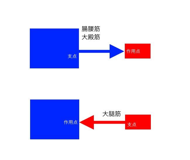 青を体幹、赤を脚とすると、これらの間の押す力は2つ(2方向)あります。体幹から脚へ働く力と脚から体幹に働く力です。両方の力が同時に作用しているかもしれません。体幹から脚へ作用する力は、大殿筋や腸腰筋が出しています。脚から体幹に作用する力は大腿の筋肉が出しています。ただ外から見る限りでは、どの力が作用して物体が動いているのか、違いはわかりません。
