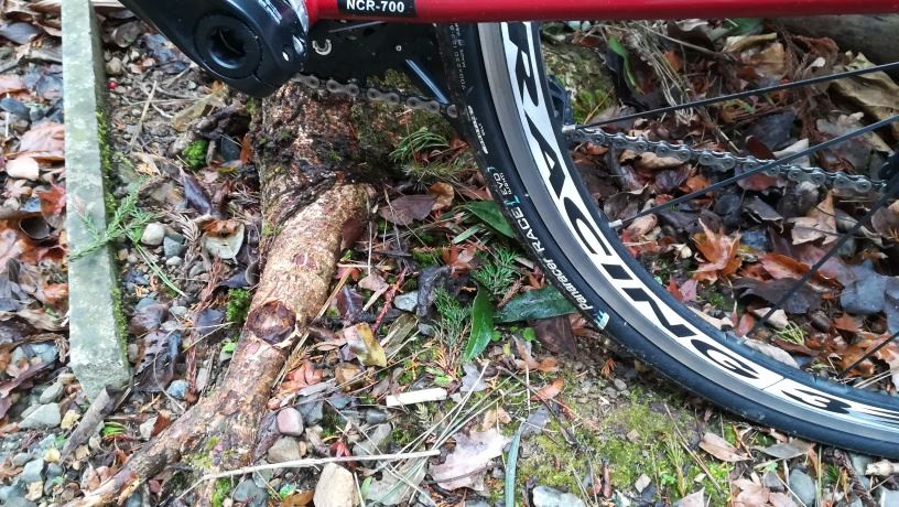 牛尾観音へ登る道は、参道の部分も含めて、本来はロードバイク向きのコースではないです。ほとんど舗装されているとはいえ、荒れている部分もあるし、木の枝が落ちていたりするし、砂利敷きの部分もあるし、参道は枕木を並べた舗装だし、ということで、「純」レース用タイヤで行くようなところではないです。なのでぼくは、レース用タイヤだったら丈夫なものを選びますし、パンクしても惜しくないような安タイヤを選びます。そういう選択基準からすると、ミシュランの高級タイヤは入ってこないのです。もちろんパヴェを走るわけですから、ミシュランも見た目よりは丈夫だとは思いますが。