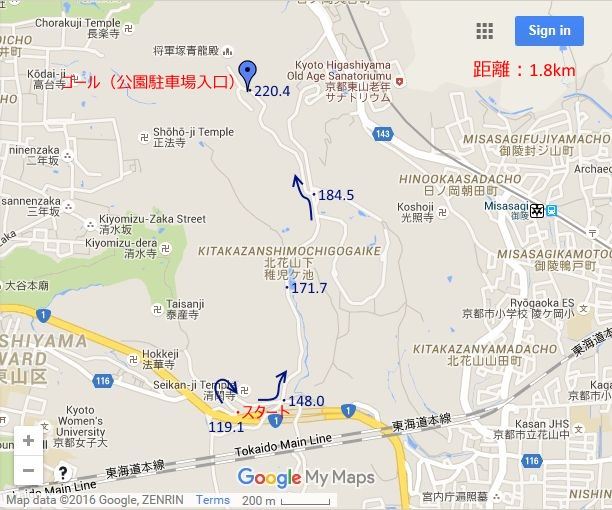 東山コースという名前が過去スレに時々出てきます。三条通り−五条通り(国道1号線)間の東山を縦断する道路です。途中で頂上にある将軍塚(青蓮院門跡)への分岐があります。東山ドライブウェーという別名がありますが、無料で通行できます。もちろん自転車も通れます。以前山科区に住んでいたころは、五条通り側から将軍塚へ登るコースを練習用として使っていました。距離は1.8km、高低差101.3m、平均勾配は5.6%です。最大勾配は12%くらい。路面状態は普通です。特に荒れているわけでもないし、かといって舗装がきれいというわけでもないです。