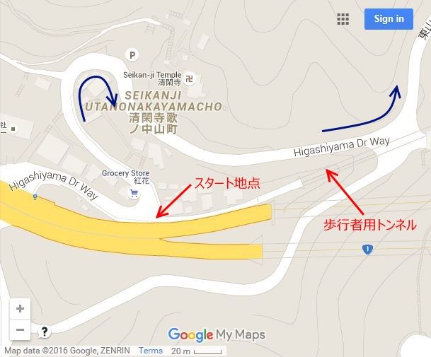 スタートは、国道1号線の東山トンネルの西側です。車道のトンネルの北に歩行者用のトンネルがあります。スタート地点は歩行者用トンネルを出てすぐのところです。