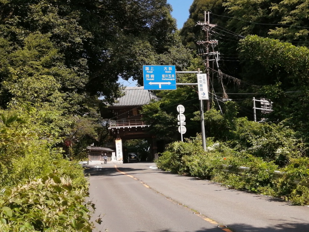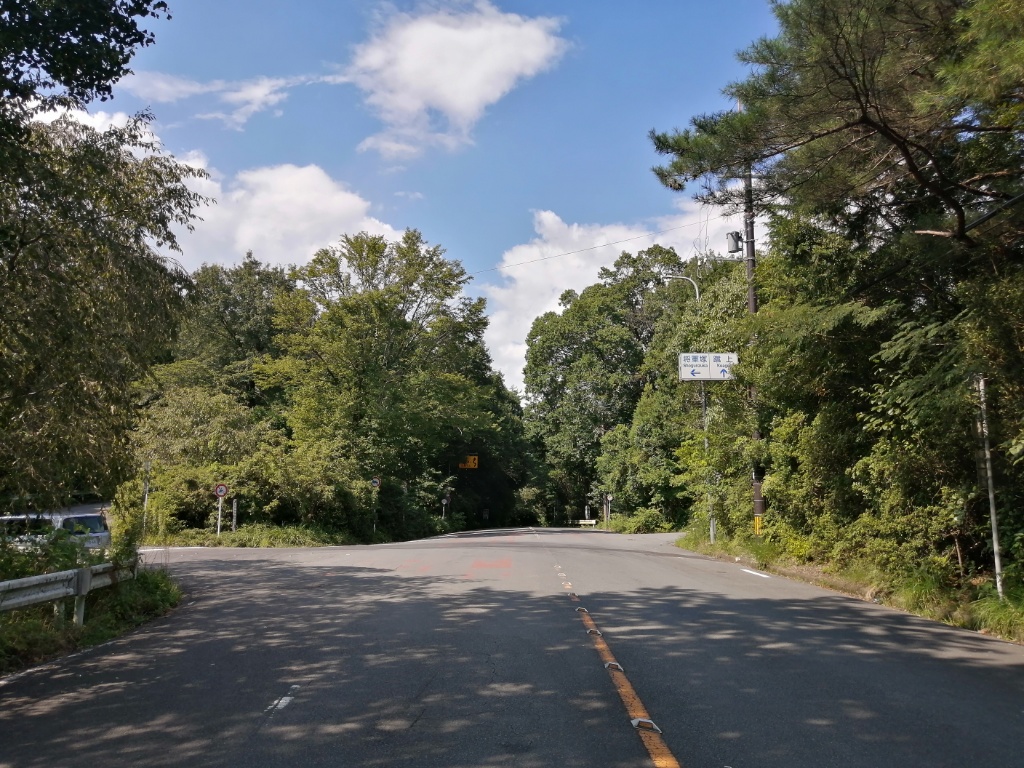 東山山荘が左に見えるところから勾配が上がります。しばらく行くと分岐があって、三条通りへは直進、将軍塚へは左折です。右側には天文台や阿含宗の施設がありますが、敷地の中には入れません。この分岐を左折します。勾配がさらに上がります。