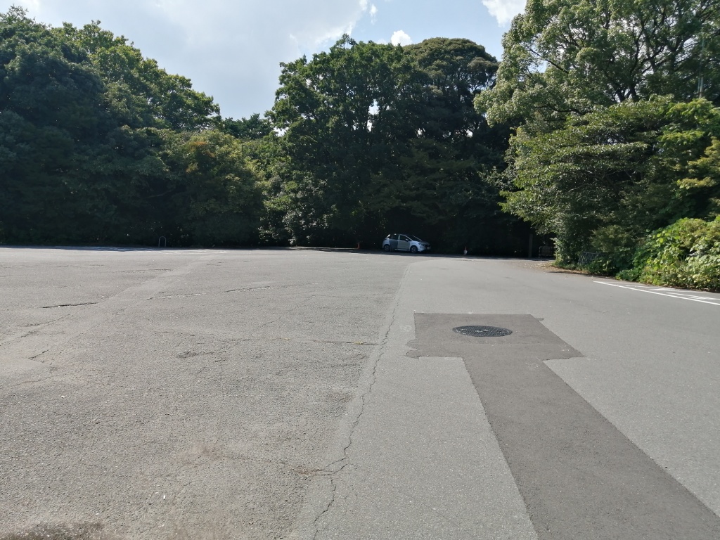 いくつかカーブがあって、最後の左カーブを曲がると駐車場が見えてきます。ゴール前スプリント区間です。ゴールは、駐車場手前の道路標識です。バスも停まれるかなり広い駐車場です。駐車場の横は公園になっています。ヘリポートがありますが、最近は使った形跡がありません。大きな病院等は屋上にヘリポートを備えているので、使う機会がなくなったのでしょう。