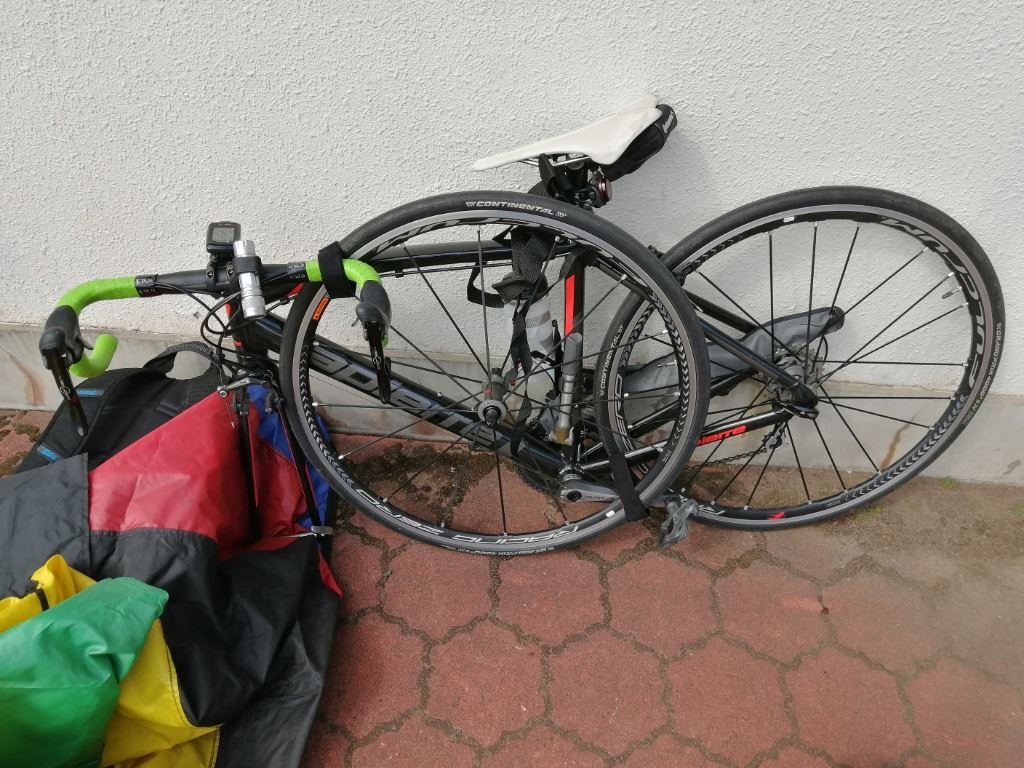 横型は、グランジのキャリーという輪行袋を使っています。外したホイールを入れる袋が付いていて、その袋に入れてフレームの左右に並べます。輪行袋自体がタイトなつくりで、ファスナーを締めると中でホイールはそんなに動きません。なので持ち運びも普通にできます。ただしタイトなつくりのせいもあって、収納できるバイクは、52サイズまでです。ぼくのバイクはぎりぎり入ります。
