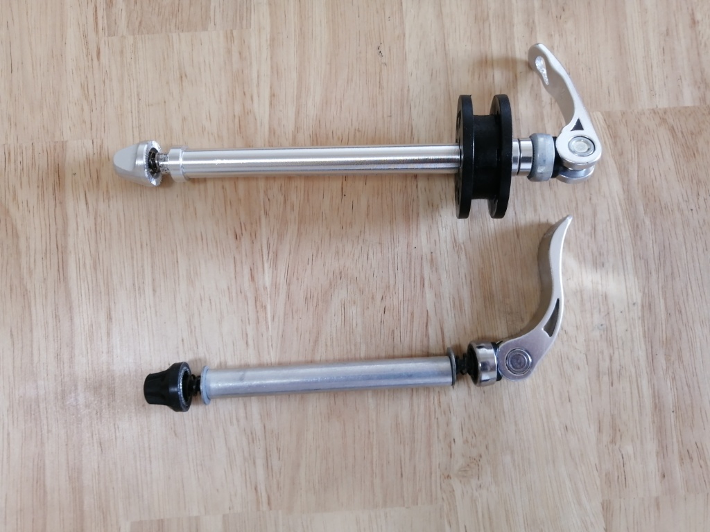 どちらの輪行袋も、サドルは下げる必要があります。ペダルは付けたままでも収まりますが、持ち運ぶ距離が長いなら、外したほうがいいと思います。縦型はエンド金具が必須ですが、他のタイプはなくてもいけます。でもぼくはエンド金具は使うようにしています。ホイールを取り付けない状態でこの部分に力が加わるのは、フレーム設計上想定してないと思うので、フレーム保護のために使います。
