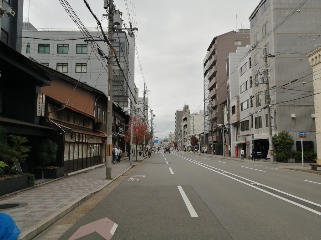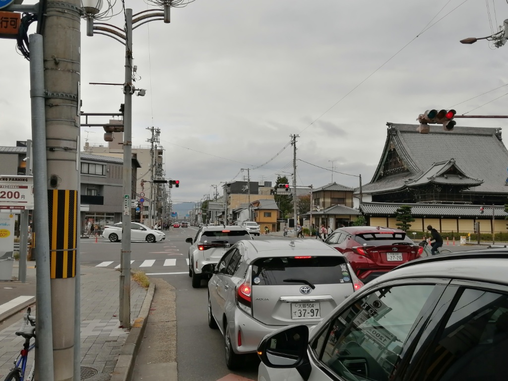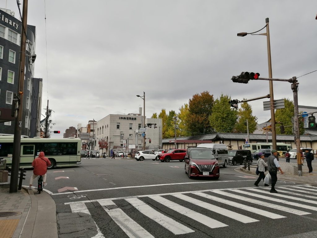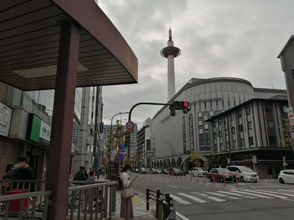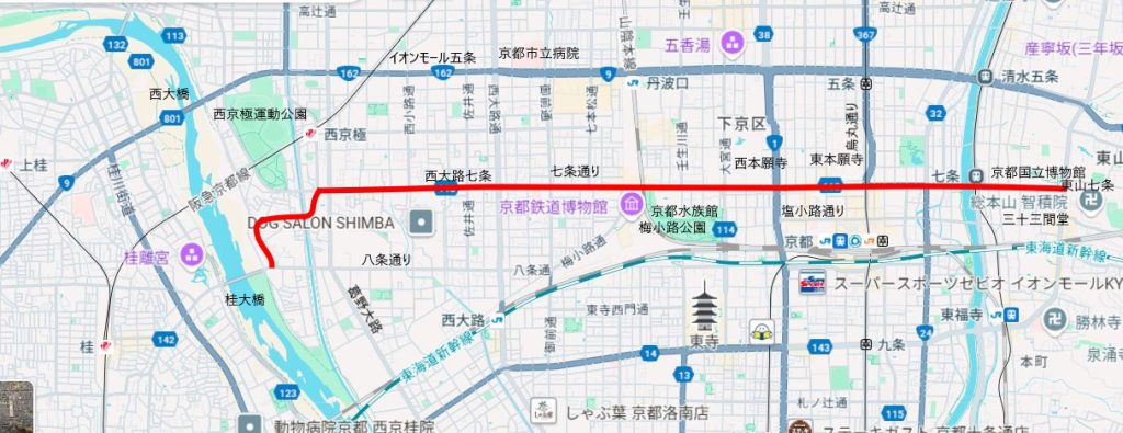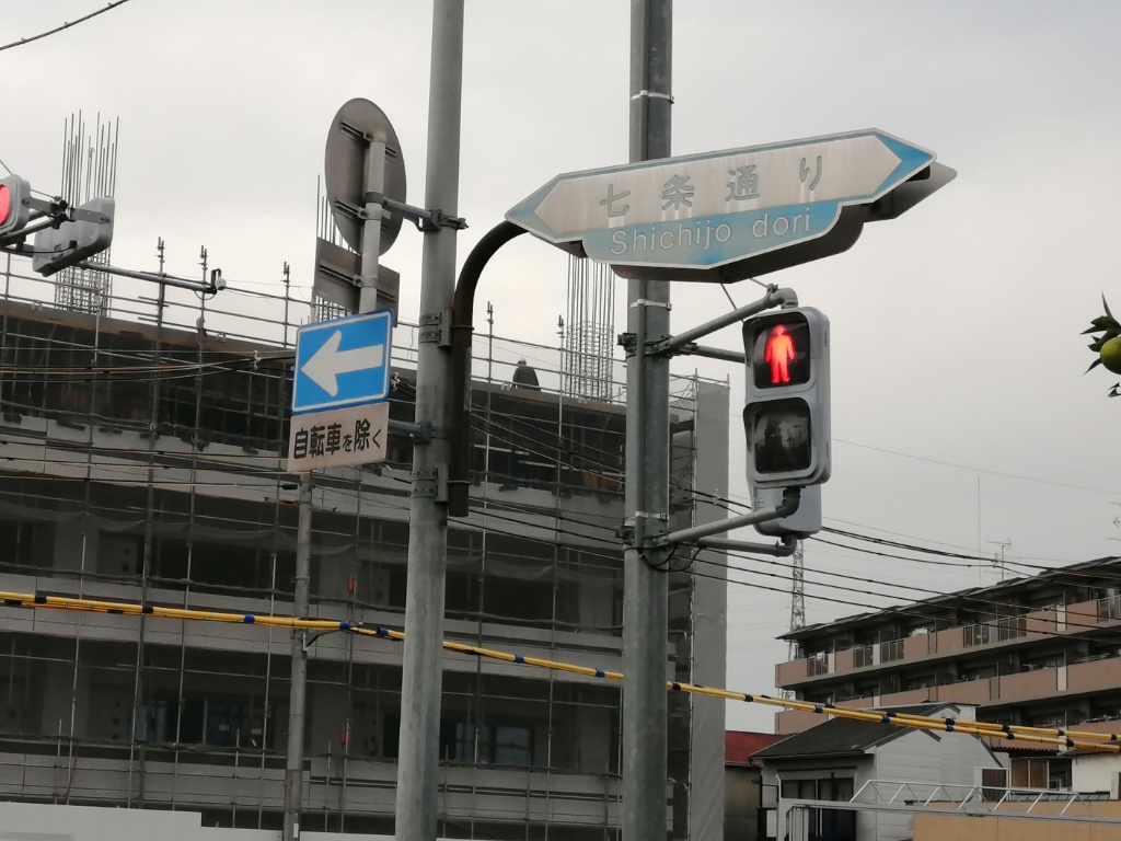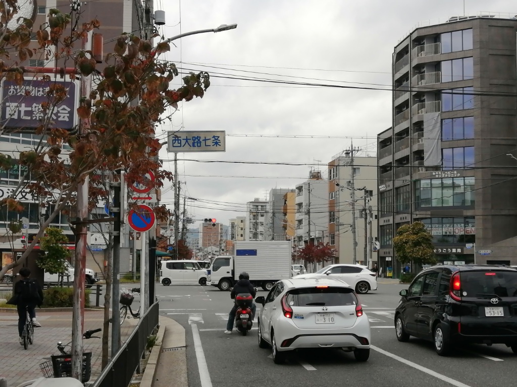 七条通りは、京都の主要な通りのひとつです。◯条通りという名称は、東西の通りに付けられます。京都駅で降りて、北側の烏丸口の方に出ます。バス乗り場やタクシー乗り場に面しているのは塩小路通りです。七条通りは、その1本北側の通りになります。