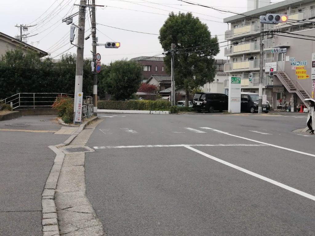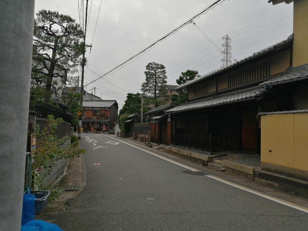 さらに行くと、道幅が狭くなります。クルマだったら思わず右折したくなるような交差点です。でも直進が七条通りです。このあたりの町名は西京極です。確かに都の西の果てという雰囲気があります。