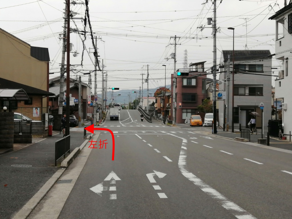 葛野大路を越えると、道幅は一時的に広くなります。七条通りは、次の交差点を左折です。つまり南に向かいます。この交差点を直進すると、天神川を越えて右にカーブし、西京極の競技場の西側で国道9号線に合流します。