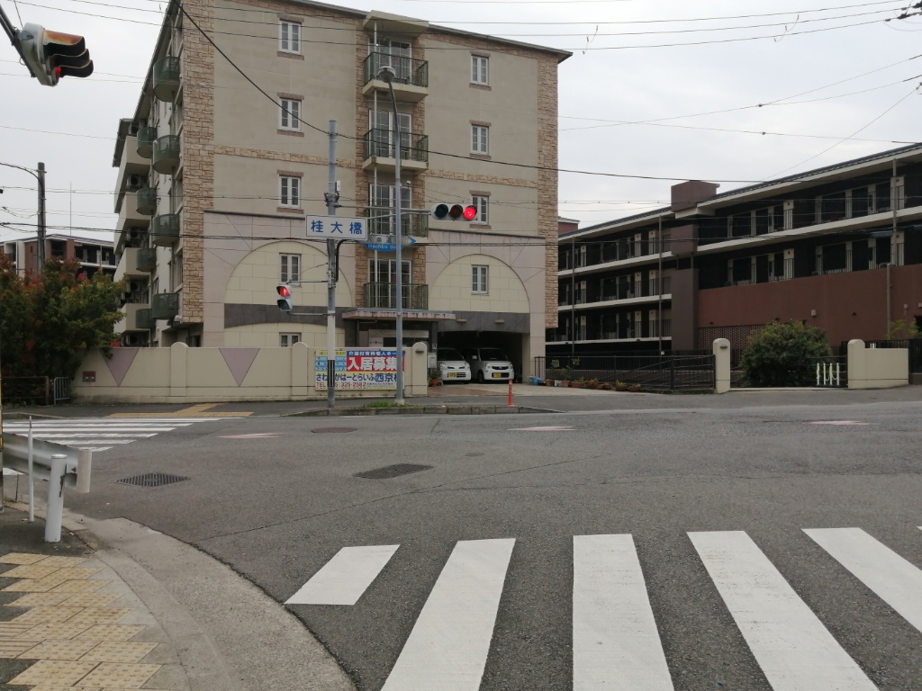そして行き着いた先は、桂大橋の東詰め。右折するとすぐに桂大橋です。桂大橋といえば八条通りです。桂大橋という標識の右に、八条通りと表示が見えます。つまり条坊制では平行であるはずの東西の通りがここで交わります。七条通りはここで終わります。