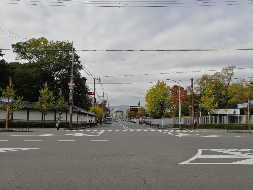 堀川七条の交差点です。右に見えるのは西本願寺です。堀川通りは国道1号線です。自動車交通的には、この通りが京都の南北方向のメインストリートと言えるかもしれません。
