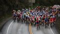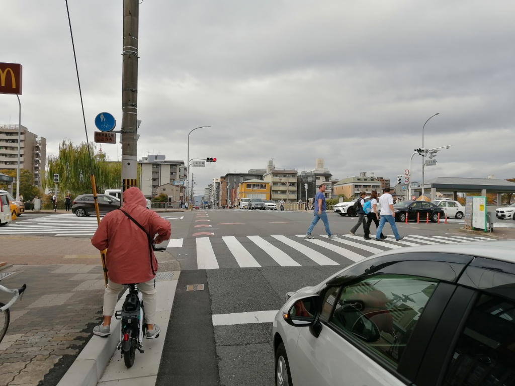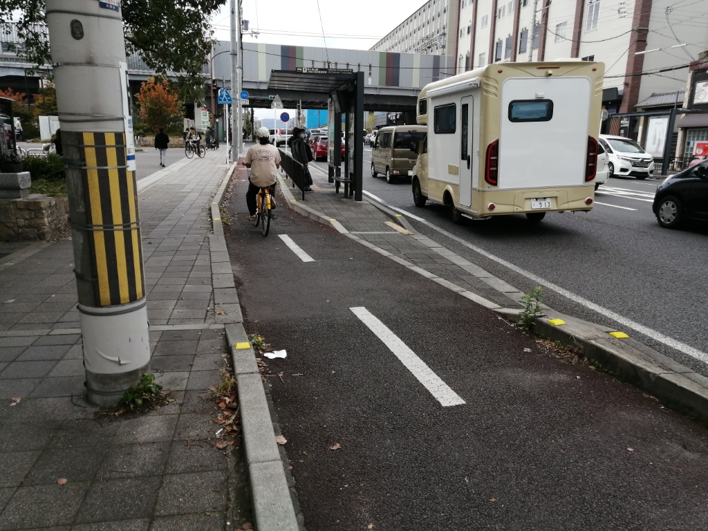 大宮通りを越えてさらに西進します。千本通りのあたりに、平安京のメインストリート、朱雀大路がありました。元々は朱雀大路を南北の軸として、東西対称の形で平安京が作られたのですが、西の地域が湿地だったことで寂れて行き、市街地の軸線が東に移っていったという経緯があります。高架で道路を渡っているのは、JR嵯峨野線(山陰本線)です。右手の線路沿いの1車線の道路が千本通りです。左は梅小路公園です。千本通りは、梅小路公園とJRの線路によっていったんここで中断しますが、線路の南側で復活します。嵯峨野線を越えた向こうの右側は、京都市中央市場です。歩道に自転車通行帯が設けられていますが、バス停では、さらに境界ブロックで分けられています。ブロックで区画するのは、段差ができるので、歩行者にとっても自転車に乗る人にとっても、かえって危険だと思います。
