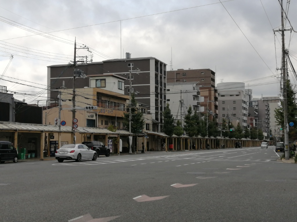 嵯峨野線の高架を過ぎると、通りの両側はアーケードの商店街になっています。今は閉まっている店舗が多いのですが、かつては中央市場の近くということで賑わっていたのでしょう。今は東京の築地市場も移転してしまいましたが、昔の築地のあたりのような風景だったのかもしれません。