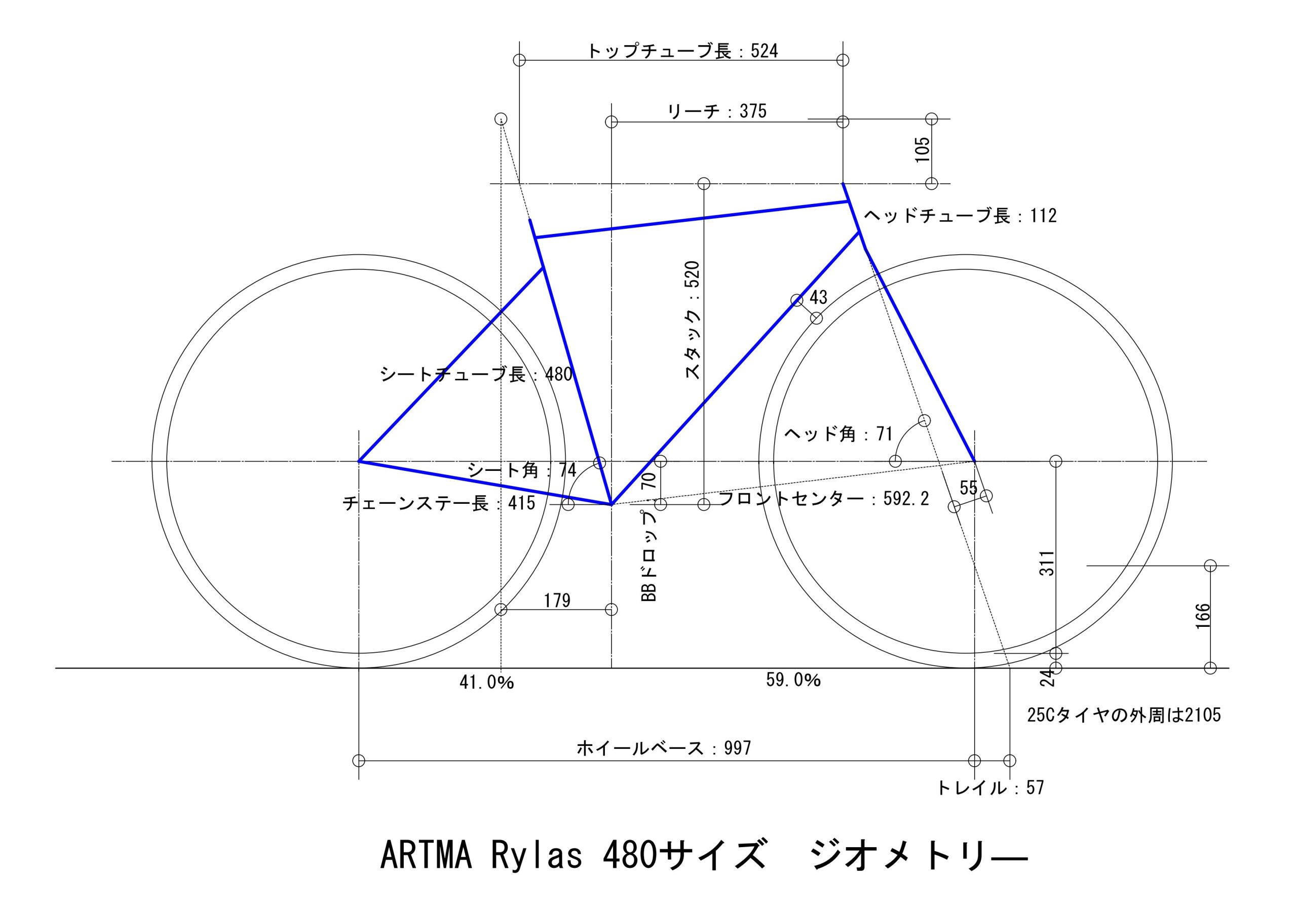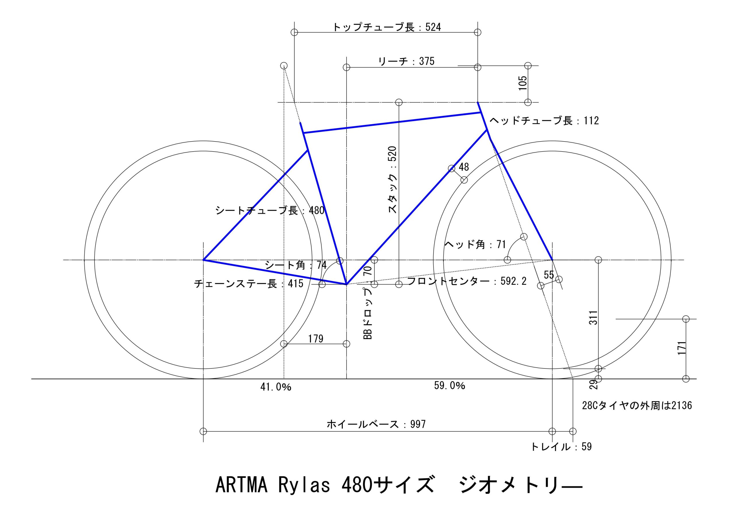 ARTMA Rylasのジオメトリ―の作図で、フロントタイヤの位置が間違っていたので修正しました。それとこのフレームで乗るとしたら28Cのタイヤにするので、タイヤを28Cに修正しました。トレイルが59㎜になります。ネットで見るARTMAの写真は、ダウンチューブとフロントタイヤの隙間が大きいように見えます。図上でジオメトリ―を再現すると、48㎜でかなり大きな値です。見た目の隙間の大きさが、作図によって実証されました。辻さんも、シューズの先がタイヤに当たるのを避けたかったということを言っているので、意図的に隙間を大きくしているということです。そのためにヘッド角を71度と小さめにし、フォークオフセットを55㎜と大きくしています。これはトレイルをロードバイクの標準的な数値に収めるためにも有効な方法でした。