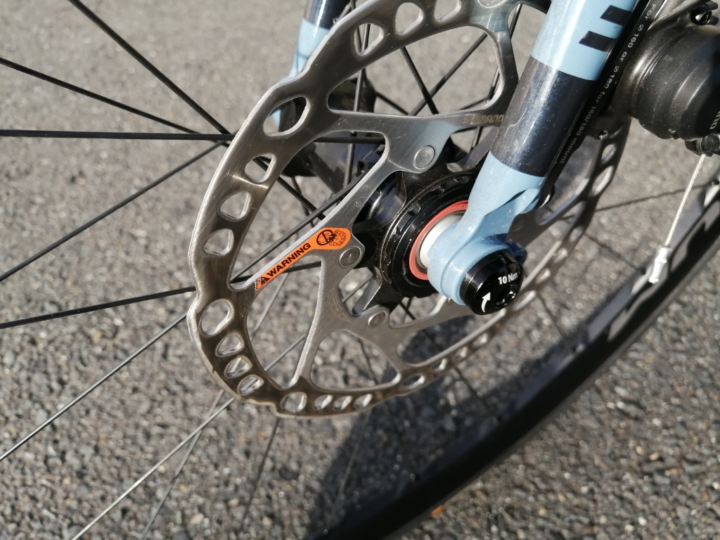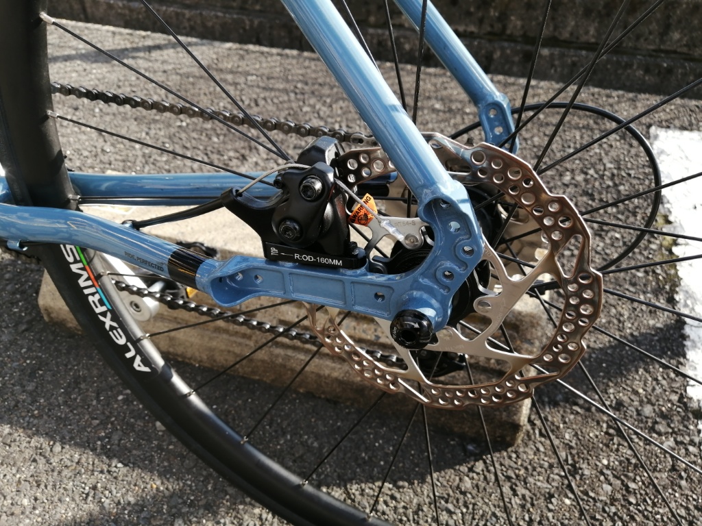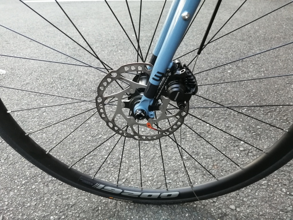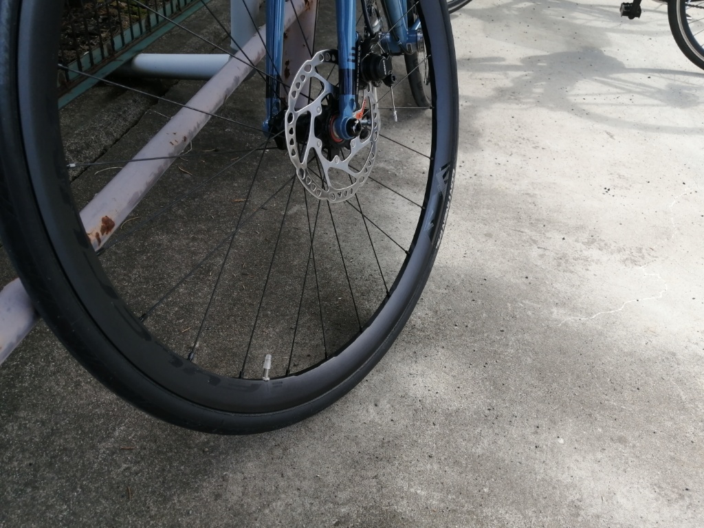 リアのディスクローターは、十分焼きが入っています。リアブレーキだけで老ノ坂峠を下ることも可能です。リムブレーキではまず無理ですが、ディスクブレーキなら可能です。Racing400のこぎ出しがそんなに軽くならないのは、たぶんAlexrimsのホイールと、リム重量がそんなに変わらないからでしょう。Racing400がホイール全体として軽いのは、スポークとハブが軽いからだと思います。スポークはRacing400の方が明らかに細いので、軽いのはわかります。ただスポークの重量差だけで300gにはならないので、ハブも軽いということになります。