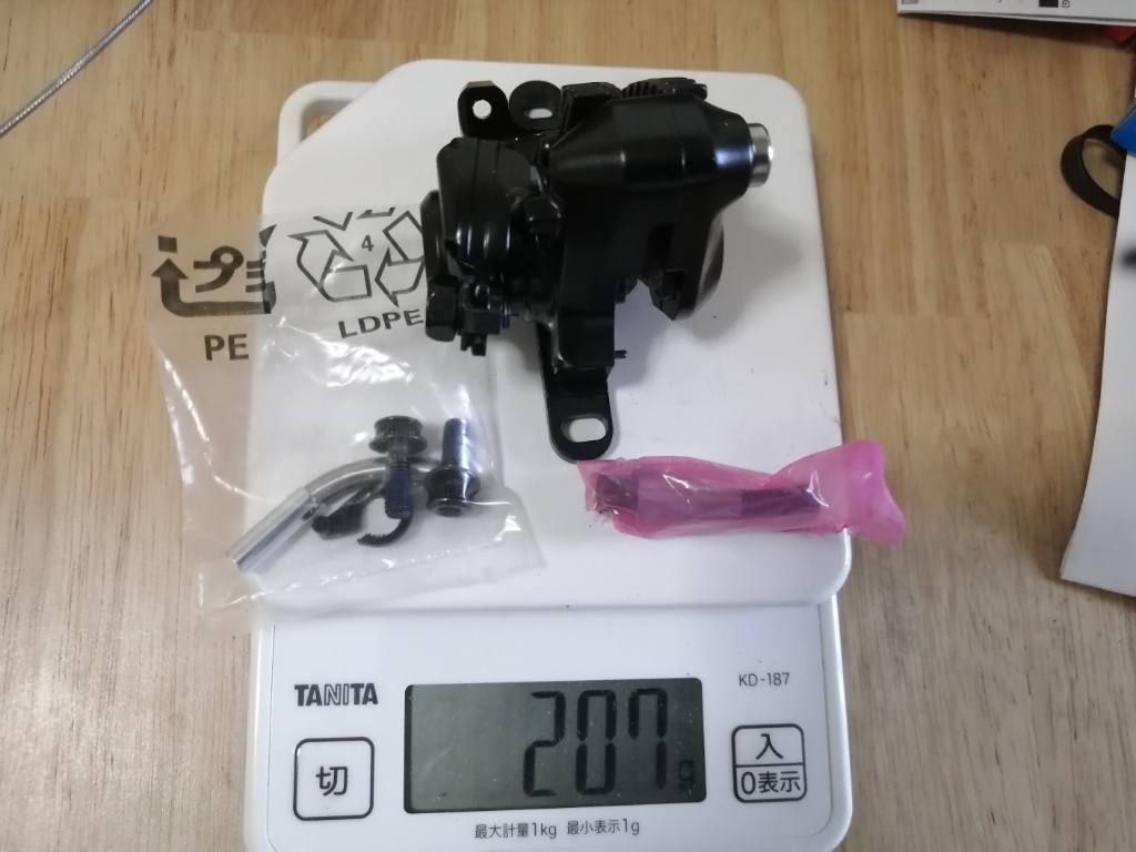 今日も空いた時間でMarteのセッティングです。BR-RS305もBR-TX805も、調整方法は同じです。動画を使った詳しい説明がネット上でいろいろあるので、調整方法はそちらを見てください。BR-TX805は本体にアジャスターがありますが、BR-RS305は本体にはなく、アウターワイヤの途中に入れるタイプが付属しています。アジャスターなしでもセッティングは出来ますが、パッドとローターのクリアランスはコンマ何ミリというオーダーでの調整が必要なので、アジャスターはあった方がいいです。