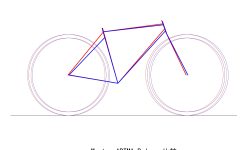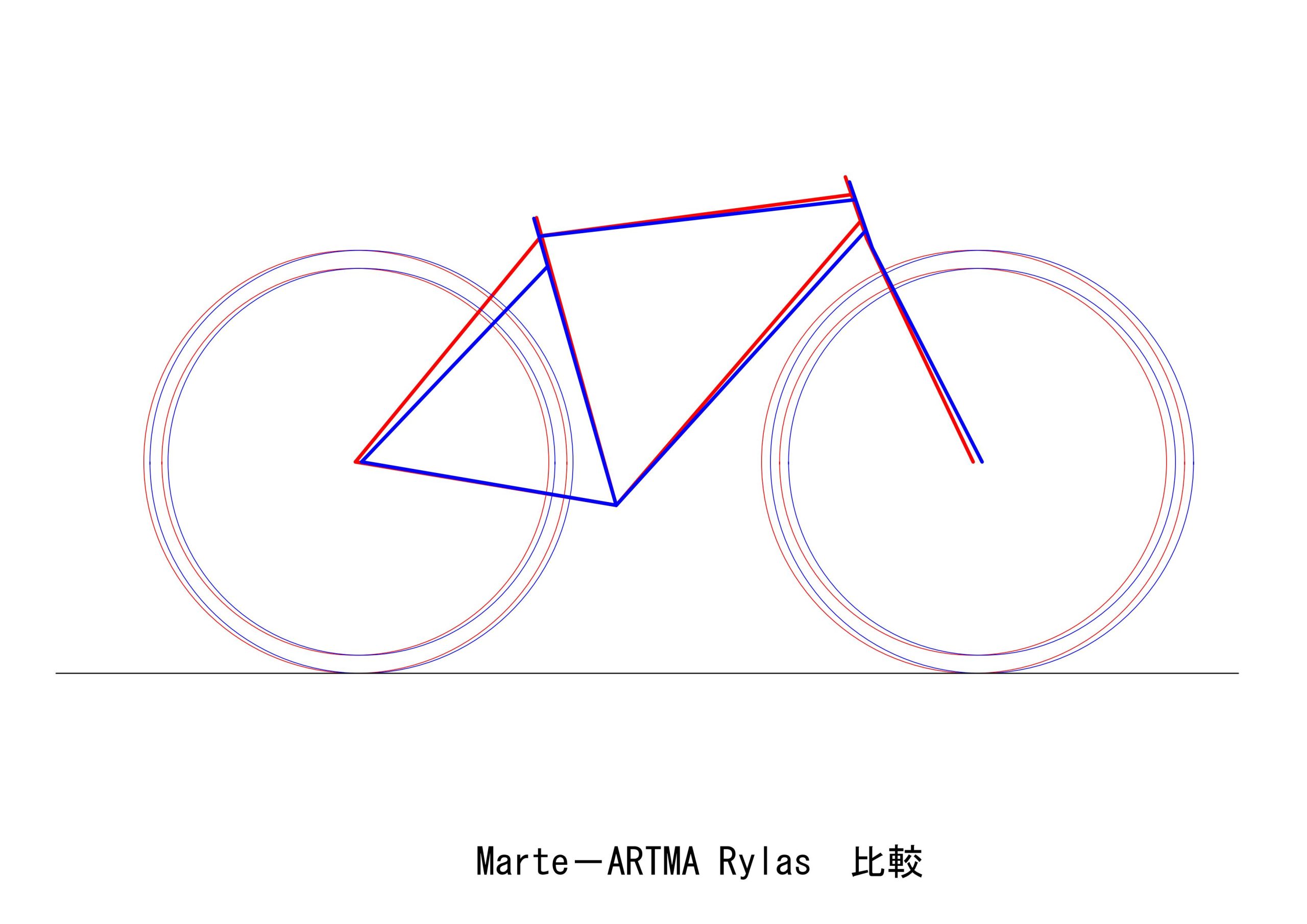 MarteとARTMAのジオメトリ―を比較してみました。赤がMarte、青がARTMAです。タイヤは28Cで統一しています。BBドロップはどちらも70㎜なので、BBの位置は一致します。ヘッドの位置はほぼ同じ。サドルの位置も同じに合わせることが可能です。なのでほとんど同じポジションになります。でも重心の位置は全然違います。BBを基準にすると、後輪はチェーンステー長が10㎜短い分だけARTMAが前に来ます。前輪は、フォークオフセットが大きい分だけARTMAが前に来ます。つまり前輪後輪共、ARTMAが前です。これだけ重心の位置が違うと、ハンドリングは違ってくるはずです。ARTMAのフォークオフセットが大きいのは、トレイルを小さく抑えるためです。トレイルは、Marteが70㎜、ARTMAが59㎜です。トレイルの違いも相まって、ハンドリングには顕著な差があるはずです。重心の位置の違いは、加速時や減速時の挙動にも影響します。乗り比べると面白そうです。