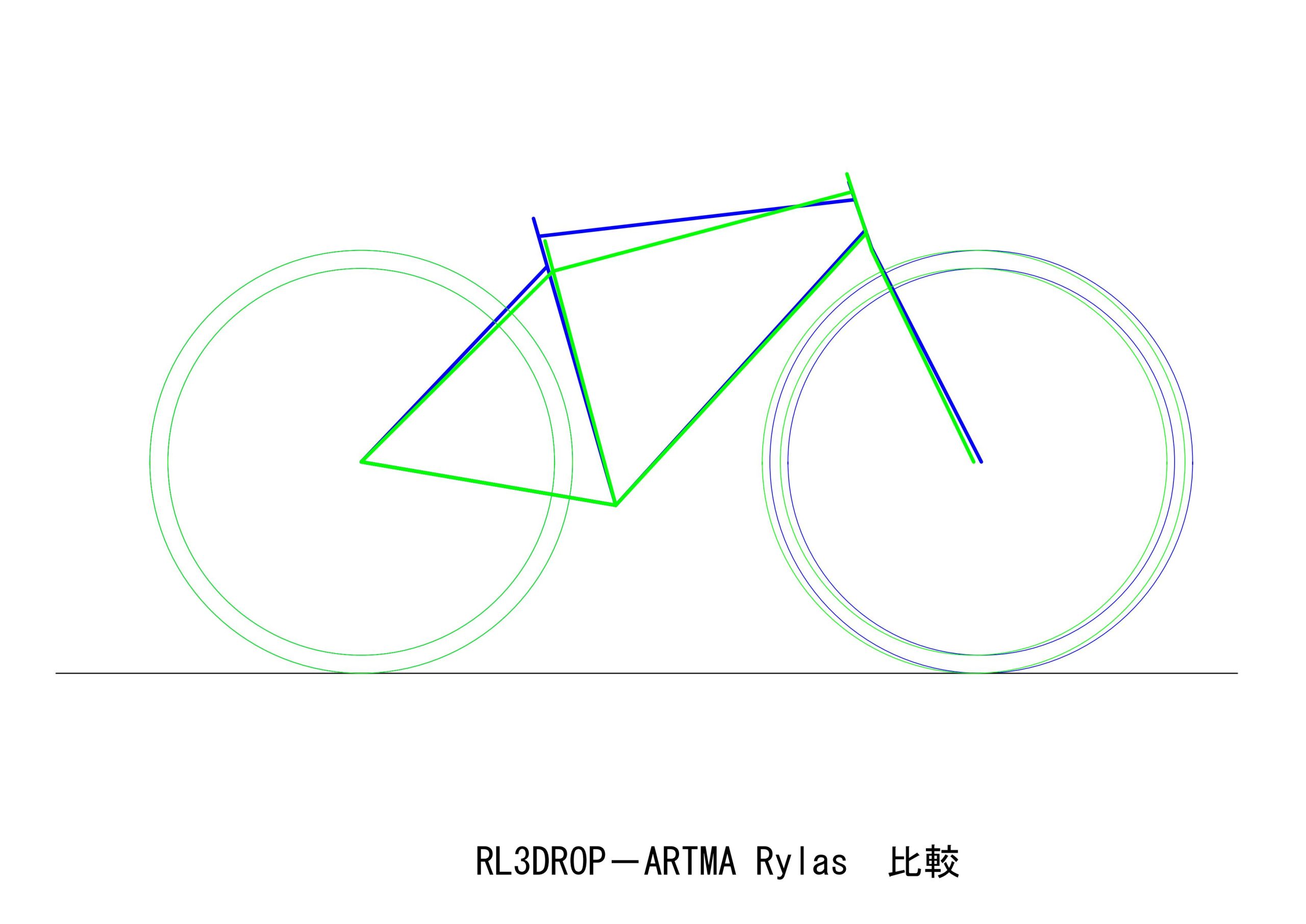 ARTMAと比較するなら、小さいサイズでのジオメトリ―にこだわりを持つAnchorだと思います。RL3 DROPというエントリーグレードのロードバイクと比較してみます。緑色がRL3 DROP 440サイズ、青色がARTMA Rylas 480サイズです。BBの位置を合わせると、後輪は一致します。ポジションはほぼ同じ。フォークオフセットが大きい関係で、ARTMAの方が前輪が前にきます。ただヘッド角はRL3 DROPの方が大きいので、タイヤが25Cの時のトレイルは57で同じです。トレイルは同じでも、ホイールベースが短いRL3 DROPの方が、動きは活発そうです。でもいい勝負になりそうです。