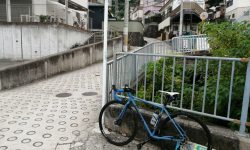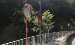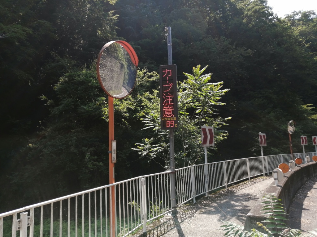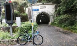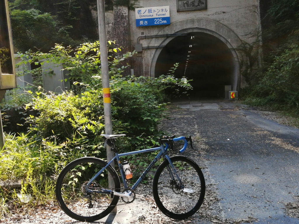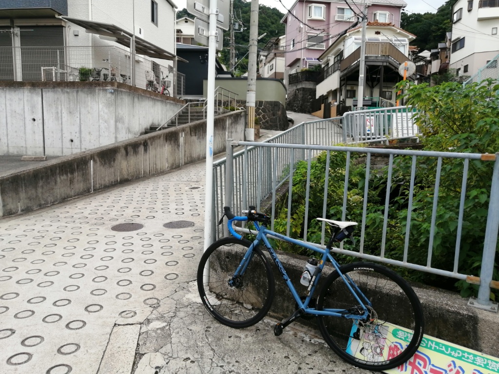 暑すぎて登れる気がしませんが、一応チャレンジします。ギアはフロント24T×リア28T。ギア比0.86。住宅地はシッティングで行けます。このギア比だとかなり勾配までシッティングで行けると思った矢先、赤い橋に行くまでの間に前輪が浮いてコントロールを失い足着き。再スタートするも、シッティングにしたところでまた前輪が浮いて足着き。赤い橋を越えるあたりはダンシングでクリアしたものの、なぜか長く続きません。体中がだるくなってきて足着き。これを何回か繰り返した後、鳥居を過ぎてからの区間は、大部分を押して歩きました。勾配が緩くなったところで乗車して、頂上のゴールへ。ゴールの石碑の左側の建物、以前は空き家でしたが、今は家具か何かの工房になっています。大阪側に下りましたが、下りはディスクブレーキの恩恵があります。握力はそこそこ必要ですが、急勾配でもレバーを握れば確実に減速できます。熱でブレーキが効かなくなる心配もありません。