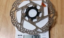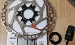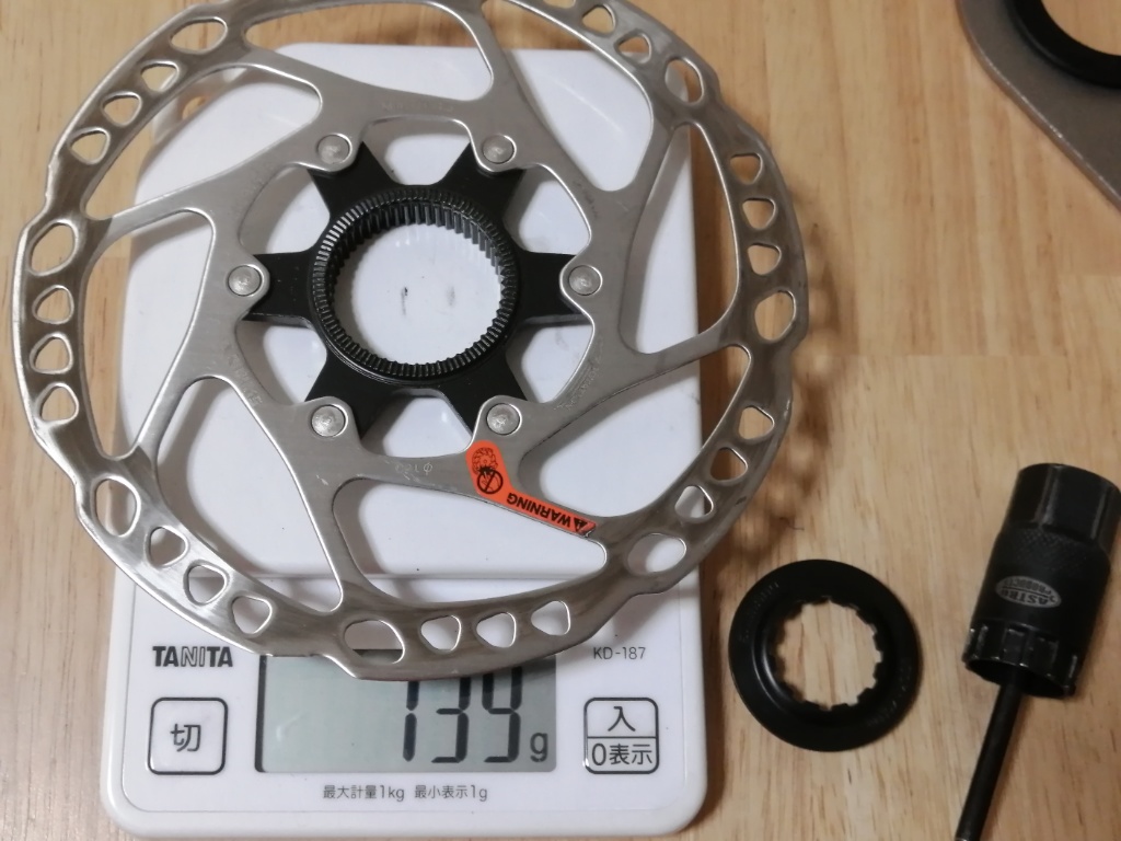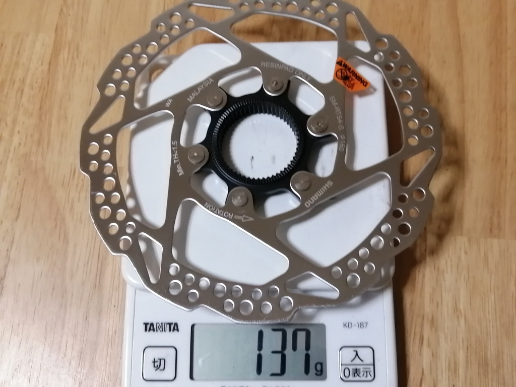 左の写真が、Marteにもともと付いていたSM-RT64です。けっこうグレードの高いローターが付いていました。ナロータイプです。ロックリングを除いて139gです。右の写真が、ホイールを買うのに合わせて購入したSM-RT54です。ワイドタイプです。重量はこちらのほうがわずかに軽くて、ロックリングを除いて137gです。MarteのデフォルトのディスクブレーキがBR-TX805なので、ローターは本来RT54が適しているのですが、なぜかナロータイプのRT64が付いてきました。