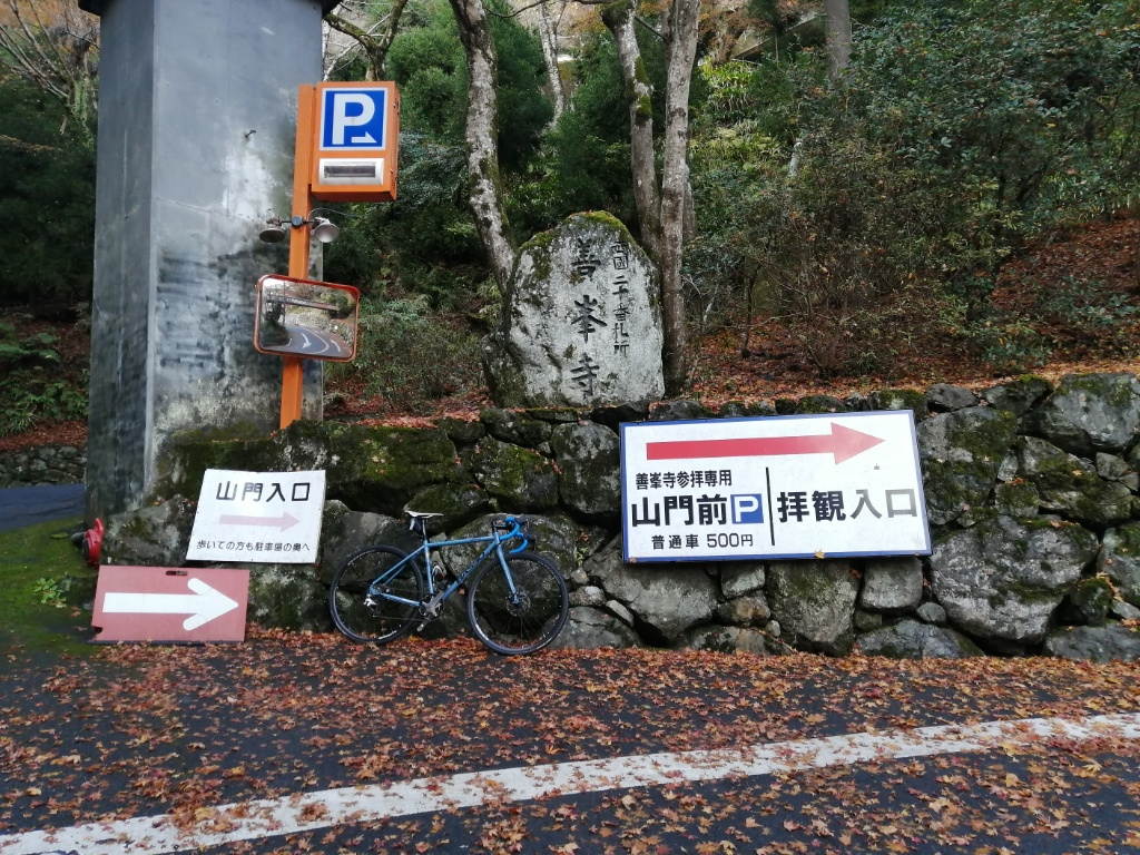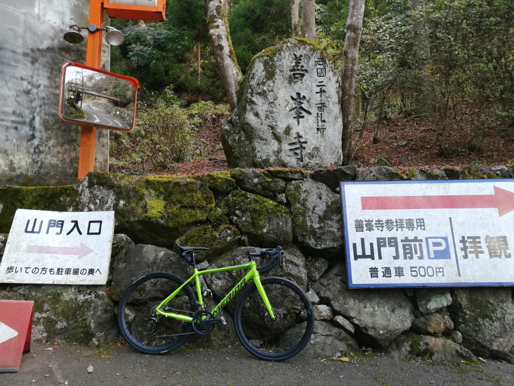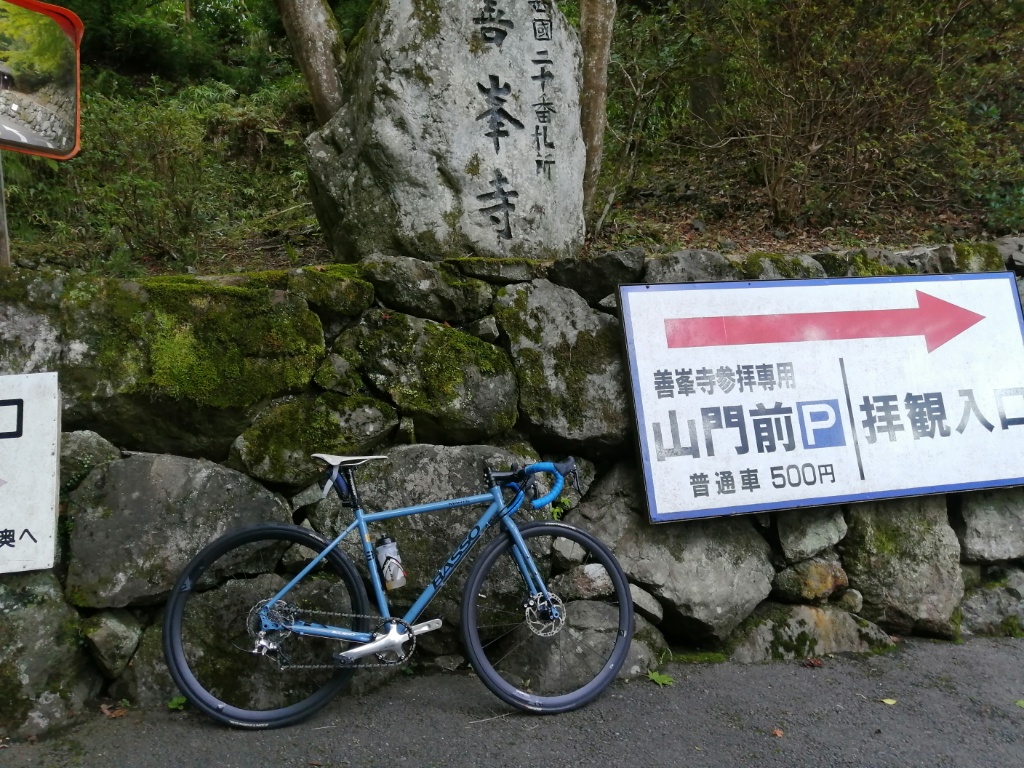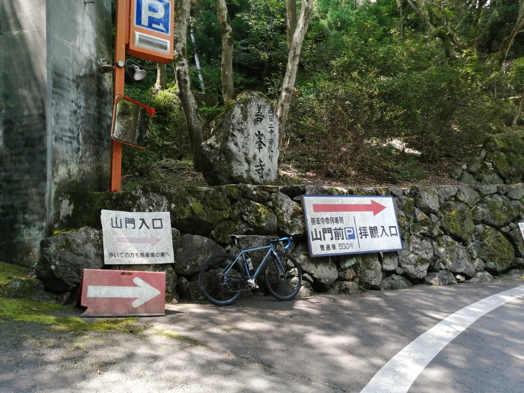 善峯寺の最後の激坂は、今回も1つ目の横断グレーチングで足着きです。ただ駐車場手前まで体力をセーブして臨めば、1.57のギア比で登れそうな気もします。
