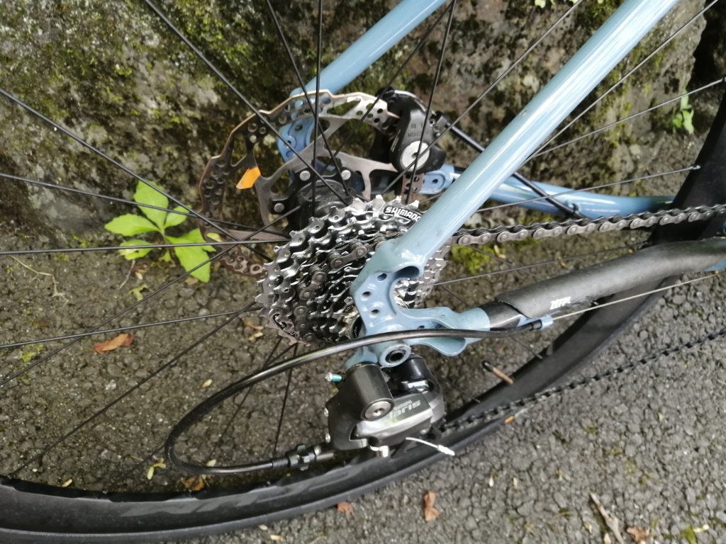 クランクは、5本アームなので、スクエアテーパー。FC-RS200かな。ディスクブレーキ・キャリパーは、フラットマウントのシマノ製ということで、BR-RS305です。スプロケットは11-34Tですが、これはシマノ製ではありません。