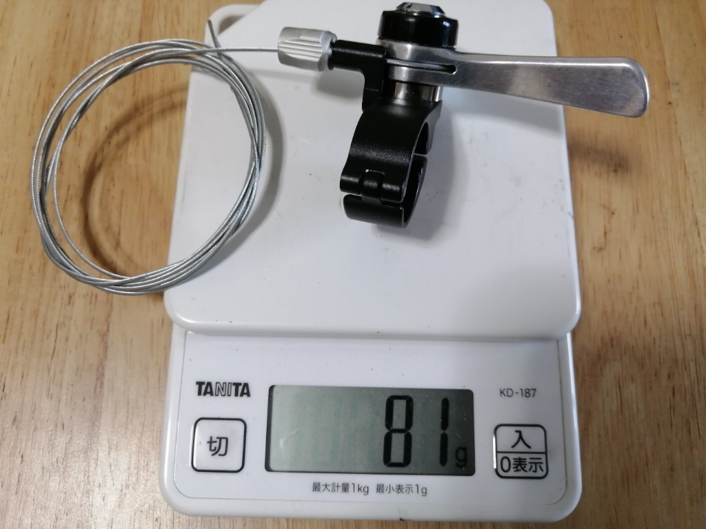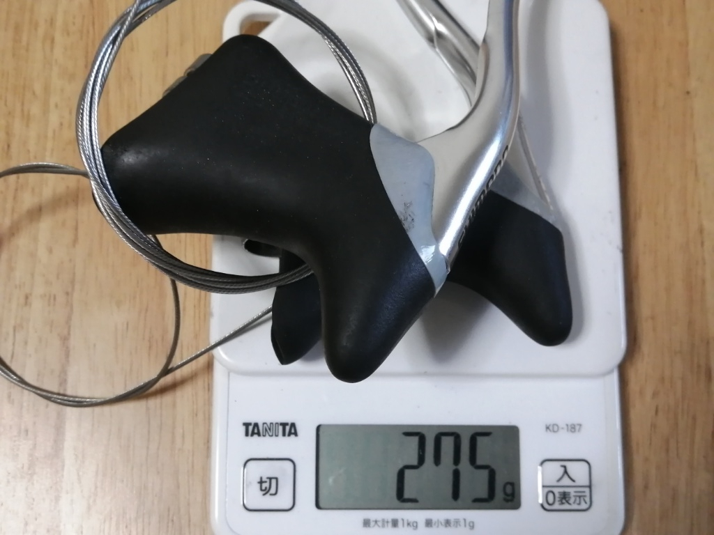 Basso Marteの軽量化に取り組んでいます。シフター関係のシュミレーションです。現在シフター兼ブレーキレバーは、カンパのXenon 9速を使っています。カンパの9速はシマノの8速(RDおよびスプロケット)と互換です。Xenonのエルゴレバーは、左右ペアで370gです。これをシマノのドロップハンドル用ブレーキレバー+Wレバー(右のみ)に交換するとします。BL-R400が左右ペアで275g、SL-R400(右レバー、Dixnaの台座共)が81gです。ワイヤーが付いたままですが、外すのが面倒なのでそのままにしています。差し引き、370−275−81=14、ということで14gの軽量化。ほとんど軽量化になっていません。せめて50gでも軽量化になれば意味があるのですが。でもやっぱりワイヤーの重量も無視できないということで、概算値で入れてみます。ブレーキケーブルが左右で25g、シフトケーブル右のみ15gとすると、14+25+15=54、54gの軽量化になります。微妙なところです。