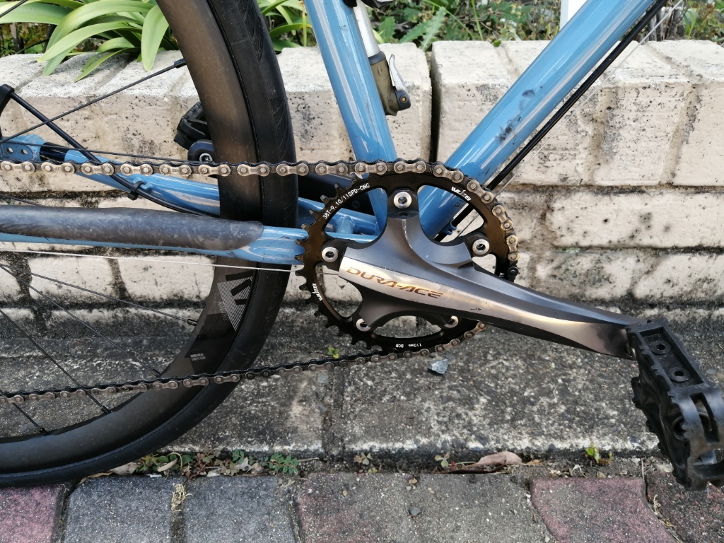 FC-7950は、今後フロントダブルで使う機会がないので(フロントダブルはカンパニョーロを使います)、このまま死蔵していても仕方ありません。フロントシングル用として活用することにします。ただ問題点は、アウターのチェーンリングがエアロ形状の専用品のため、他品番や他社のチェーンリングを取り付けると段差ができることです。それでもアウターの位置にチェーンリングを取り付けられればまだましですが、今回は形状的にアウター位置にチェーンリングが嵌まらなかったので、インナー位置に取り付けています。