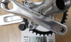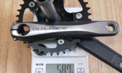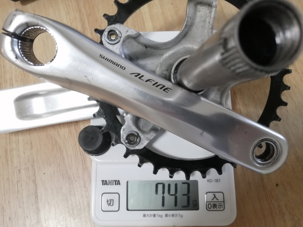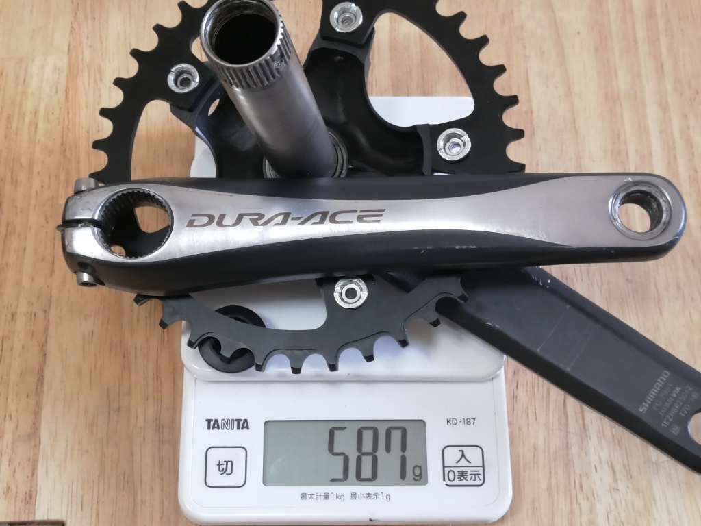 Marte軽量化計画の最終手段は、クランクの軽量化しかありません。今使っているのが、Alfineのクランク(PCD130)に38Tのナローワイドチェーンリングを付けたもの。重量は743g。これをFC-7950(PCD110)に38Tナローワイドチェーンリングとすると、重量は587g。743−587=156gの軽量化になります。Dura-Aceのすごさを改めて感じます。