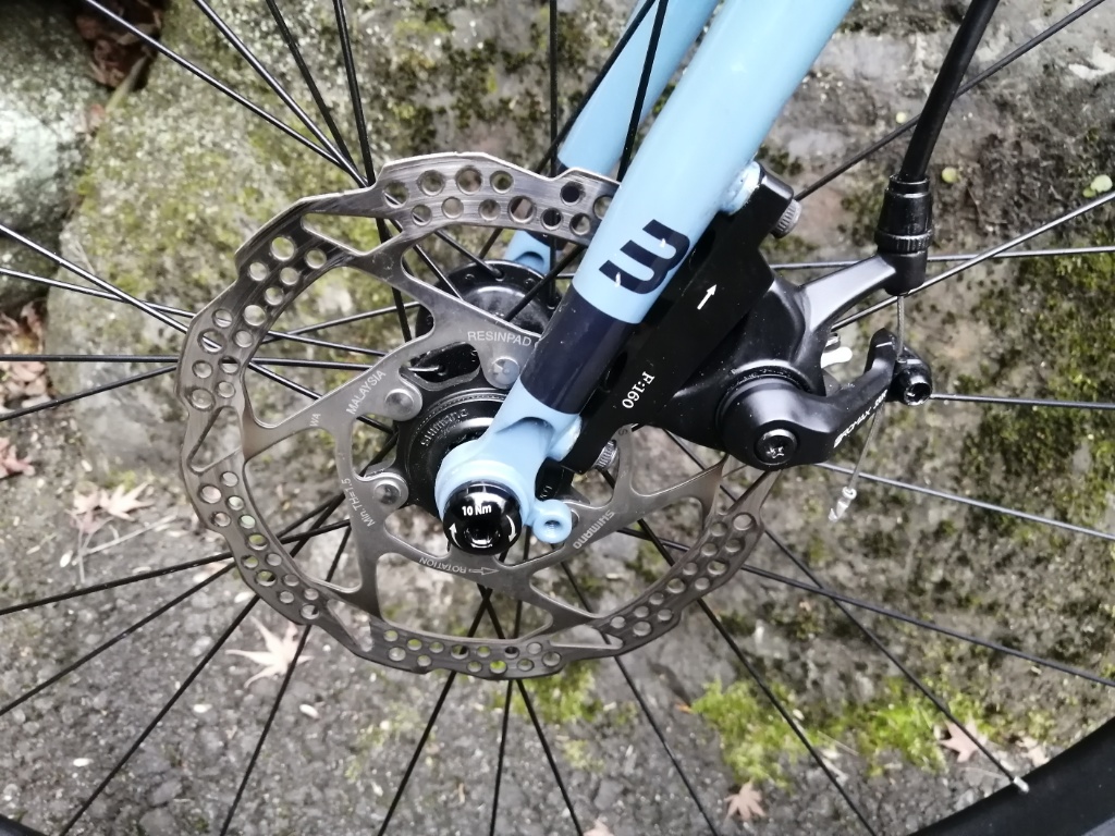 交換したのはフロントのみです。シマノのBR-RS305のフロント用。もともと付いていたのは、BR-TX805というTourneyグレードのポストマウントのディスクブレーキ・キャリパーです。Marteのフレームはフラットマウントなので、BR-TX805はアダプターを介して取り付けられていました。BR-RS305はフラットマウント対応なので、そのまま取り付けることができます。見た目はかなりスッキリしました。