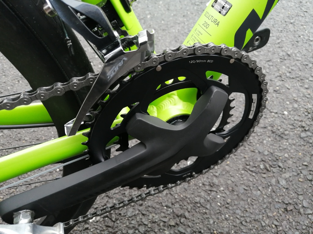 クランクは、FSA Omega 50/34T。BBはプレスフィットです。シャル幅86で、FSA BB-AL86というBBが使われています。クランクの軸径は19φ。シマノのクランクとの互換性はありません。販売店にも確認しましたが、シマノのクランクを使うには、BBも交換する必要があります。このクランク、デザイン的には悪くないので、しばらくはそのまま使います。ただPCDが120/90と特殊です。対応するチェーンリングは、おそらくFSA純正しかないでしょう。となると、フロントシングル化は難しいかもしれません。