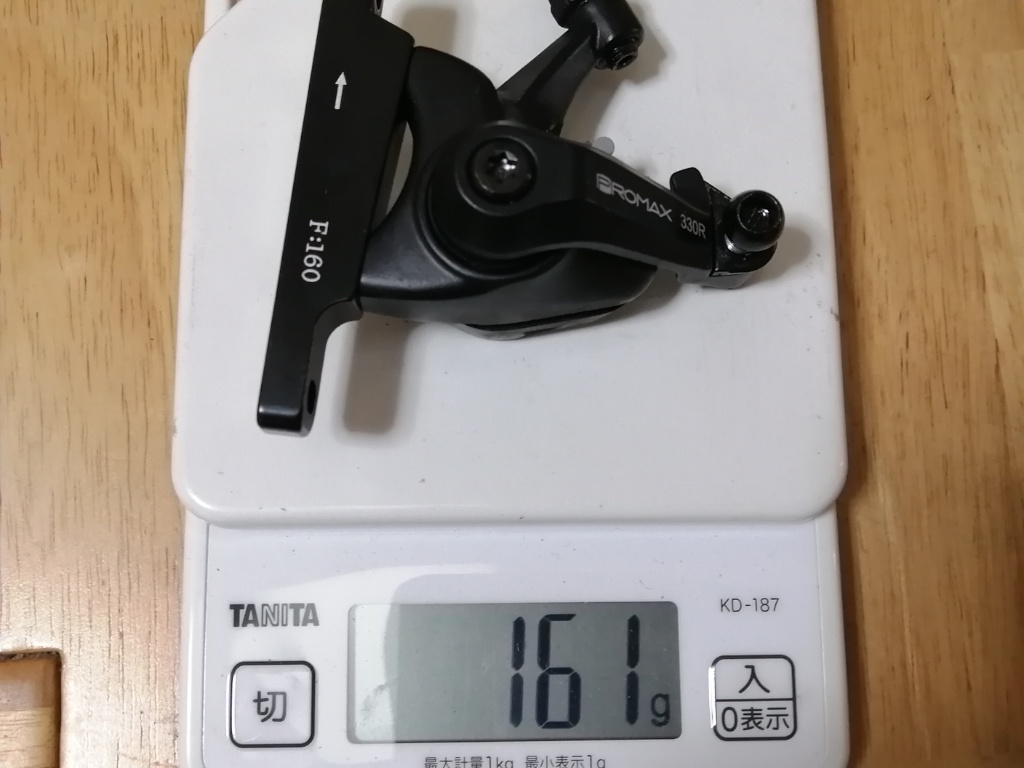 まずは重量測定。フロントのキャリパーです。アダプター込みの重量です。330Rが161g、RS305が191g。前後だと60g違います。重量ではPromaxに軍配が上がります。