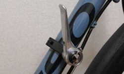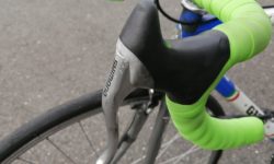 DIA-COMPE(ダイヤコンペ)のWシフトレバーです。Marteに付けています。Wレバーなので本来は左右のレバーがセットなのですが、フロントシングルなので、右レバーだけを使っています。Wレバーにはインデックス式とフリクション式がありますが、DIA-COMPEのはフリクション式です。左右のレバーのセットで、値段は現在6,000円前後です。STI等の手元シフト全盛ですが、Wレバーも根強く残っています。ただし対応するフレームが少なくなっているかもしれません。いわゆるWレバー台座というのが必要です。もし台座がない場合、アダプターで取り付けができる場合もあります。Marteは台座がないので、MR.CONTORLのアダプターを介して取り付けています。フレームのパイプ径によっては、取り付けられない場合もあります。Wレバーの良さは、何よりも機構がシンプルなことです。ほぼメンテナンスフリーです。フリクション式は一見変速操作が難しそうですが、実際はほぼ一発で変速が決まります。つまり次の段にチェーンが移動したところで、自然と操作する手の動きが止まるような感じです。フリクション式は、ディレーラーのバネの力に負けて、レバーが勝手に動いてしまうのではと心配されるかもしれませんが、DIA-COMPEのはその点は大丈夫です。内部にラチェット機構が組み込まれています。それによって、操作の軽さとディレーラーのバネへの抵抗を両立させています。