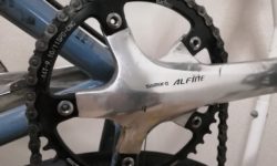 内装変速用のコンポ、ALFINEのクランクです。内装変速用なので、クランクはシングルです。歯数は、39T、42T、45Tから選べます。PCDは130。値段は18,000円程度。中空クランクではありません。でも重量はそこそこ軽いです。ずっと作り続けられるというなら、スクエアテーパーBBのFC-RS200という選択肢もありますが、ホローテックBBの方が、やはり重量のアドバンテージはあります。ALFINEシリーズは、あまり表には出てきませんが、おそらく地味に作り続けられることでしょう。ぼくは今、Marteのクランクとして、このクランクを使っています(マイナーチェンジ前のFC-S500ですが)。実はこのクランク、PCD130の普通のノーマルクランクです。写真2枚目のように、インナーギアを取付けられるようになっています。というか、元々チェーンガードが付いた仕様なので、チェーンガードがアウター側、チェーンリングがインナー側に付いています。ぼくが購入したのは45Tのクランクですが、ロードのフレームでは45Tをインナーに付けると、チェーンステーに干渉します。そこでチェーンガードを外して、チェーンリングをアウター側に付け直したわけです。39Tならインナー側のままで大丈夫です。なので、PCD130のノーマルクランクとして取り扱う方が自然です。